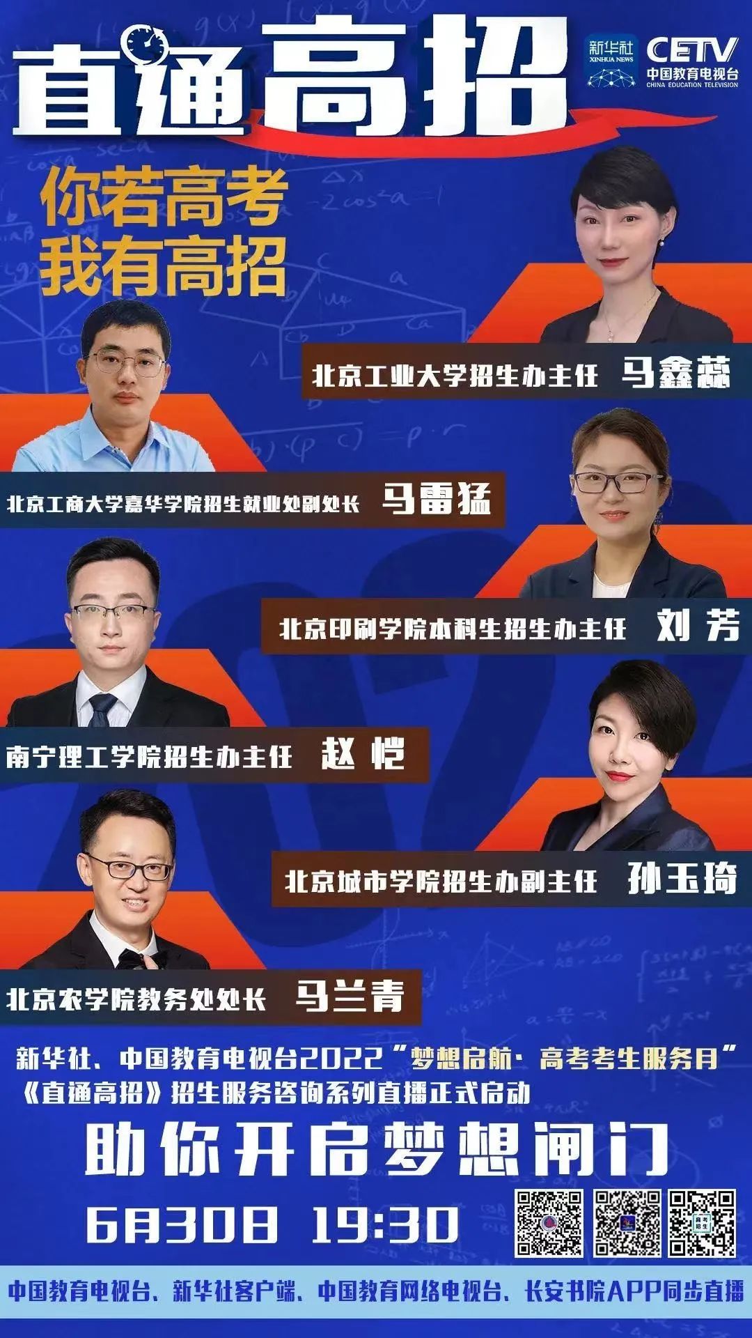 重磅预告:2022&ldquo梦想启航·高考考生服务月&rdquo高招季,新华社新媒体中心、中国教育电视台共同推出《直通高招》招生服务咨询系列直播活动,(今天)下午19:30,您可以通过中国教育电视台或登录新华社客户端、中国教育网络电视台、长安书院APP等平台观看北京工商大学嘉华学院直播内容。